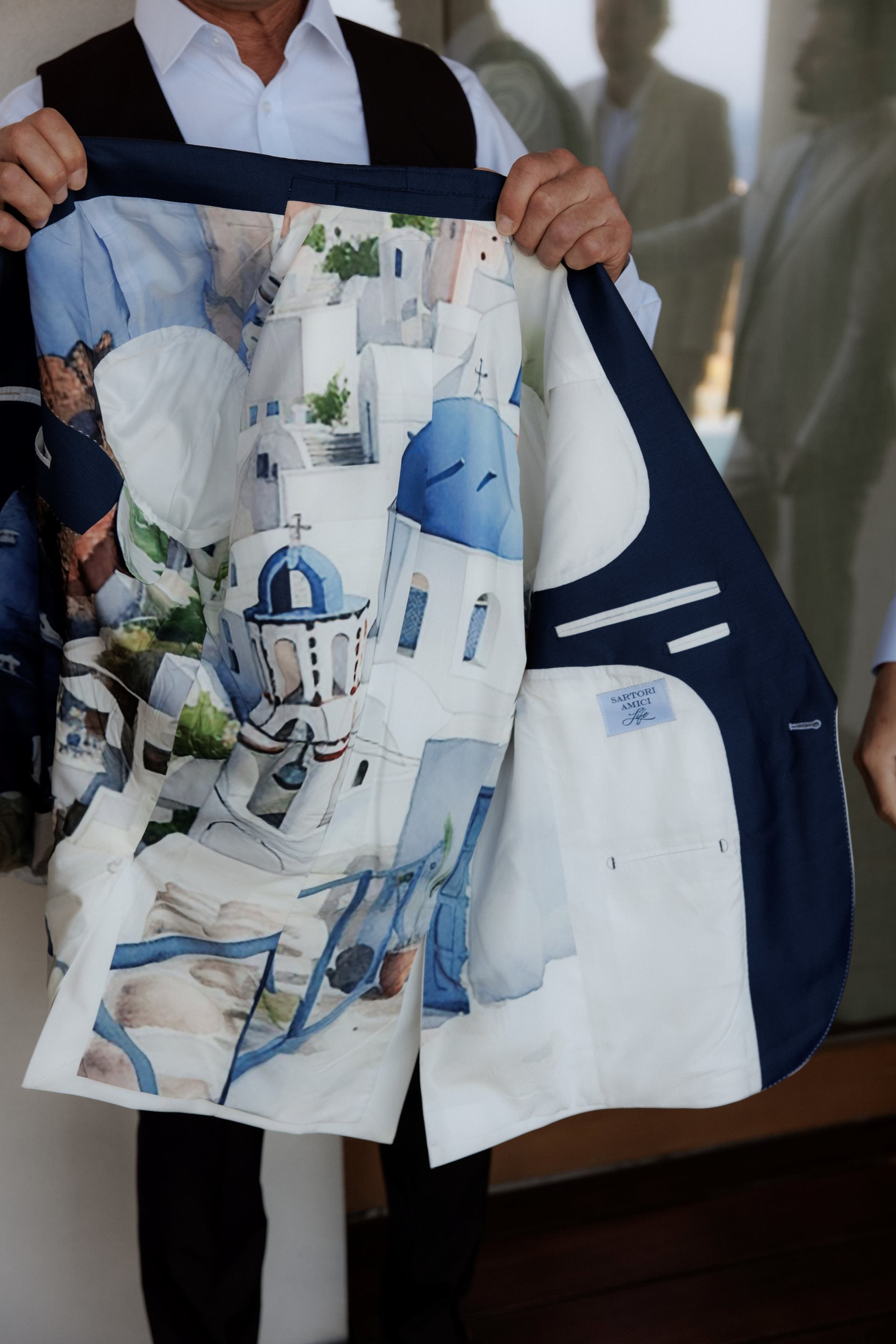 Off white tropical wool jacket with a contrast lapel and custom lining of your choice! We recommed to pair it with a double breasted waist coat and matching pants.