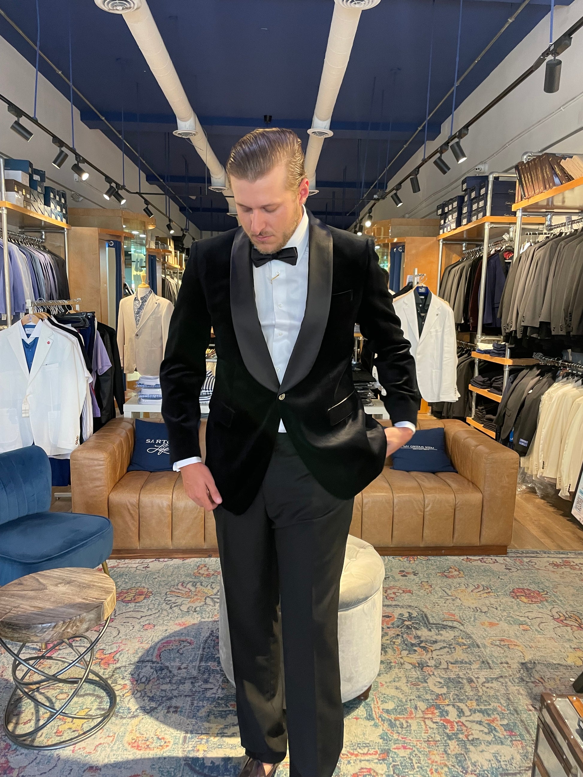 Step into sophistication and style with our custom-made velvet shawl lapel black tuxedo jacket with rich texture that adds depth and dimension to your ensemble. The classic black hue lends timeless appeal, while the shawl lapel exudes an air of old-world charm and sophistication.